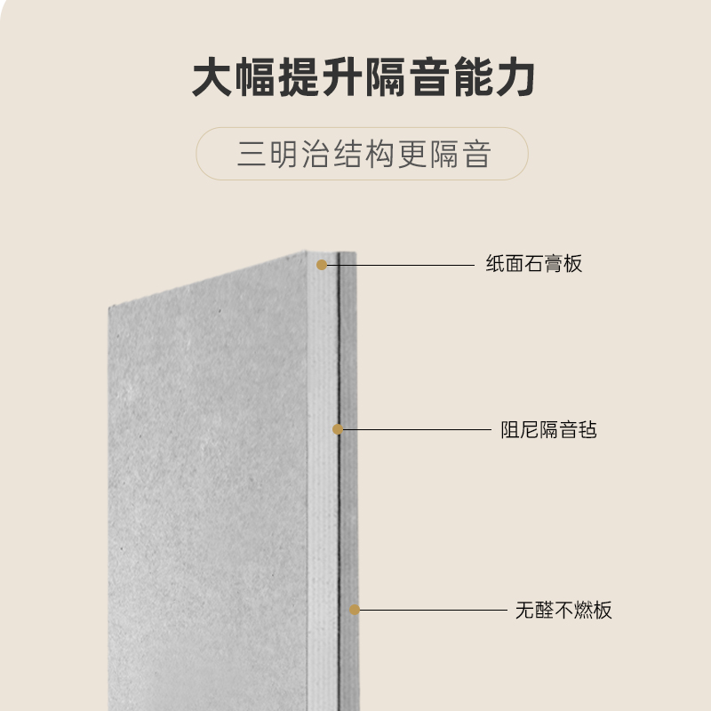 产品基材:纸面石膏板+阻尼隔音毡+无醛不燃板